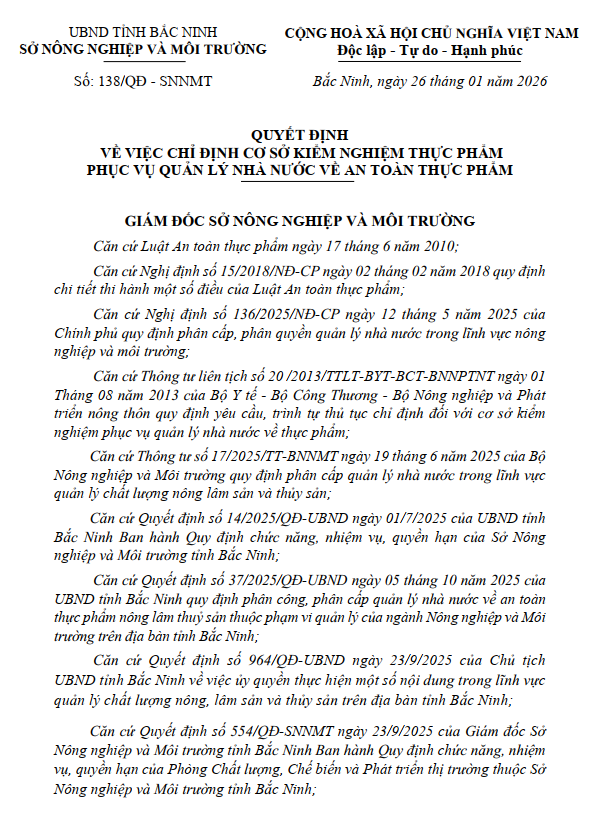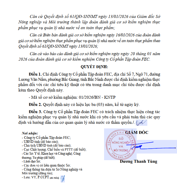 Ngày 26/01/2026, Sở Nông nghiệp và Môi trường tỉnh Bắc Ninh ban hành Quyết định số 138/QĐ-SNNMT về việc chỉ định cơ sở kiểm nghiệm thực phẩm phục vụ công tác quản lý nhà nước về an toàn thực phẩm. Theo đó, Công ty Cổ phần Tập đoàn FEC chính thức được giao thực hiện kiểm nghiệm thực phẩm đối với nhiều chỉ tiêu kỹ thuật quan trọng theo quy định hiện hành.