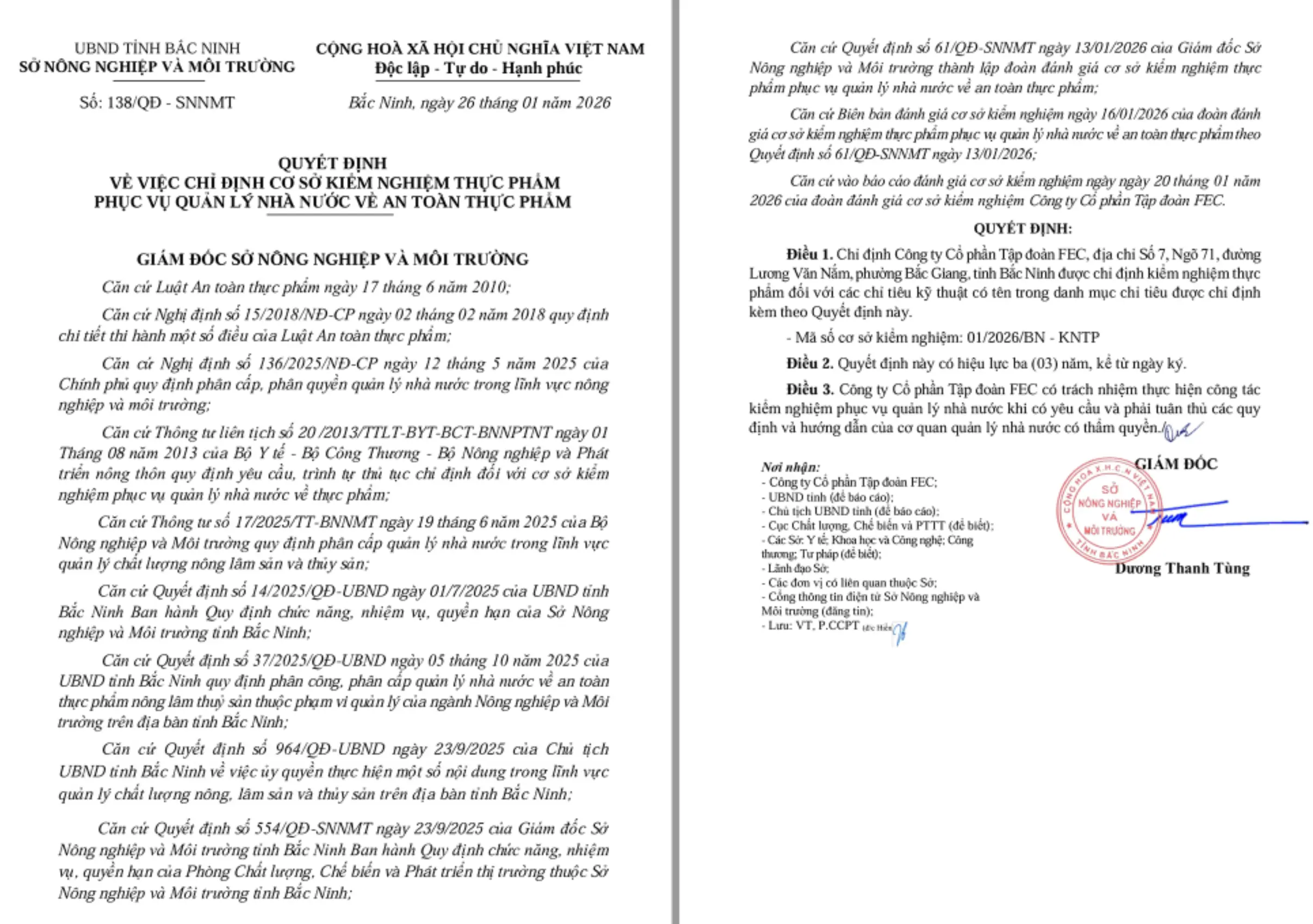 Với năng lực chuyên môn cao, Công ty Cổ phần Tập đoàn FEC tự hào là đơn vị được cơ quan nhà nước chỉ định thực hiện kiểm nghiệm thực phẩm phục vụ quản lý an toàn thực phẩm theo Quyết định số: 138/QĐ – SNNMT của Sở Nông nghiệp và Môi trường tỉnh Bắc Ninh.
